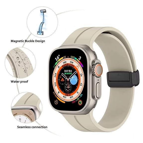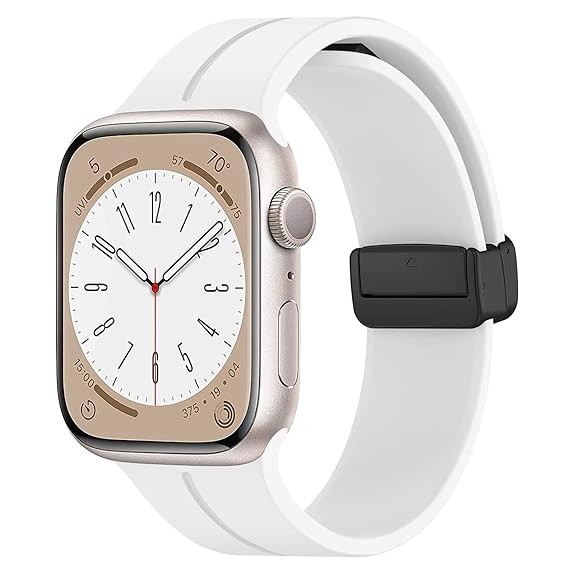 Compatible with all Apple Watch models (38mm–49mm), this sleek sport band features a foldable magnetic clasp for quick, secure wear. Made from skin-friendly silicone, it's waterproof, sweatproof, and perfect for daily use or workouts.